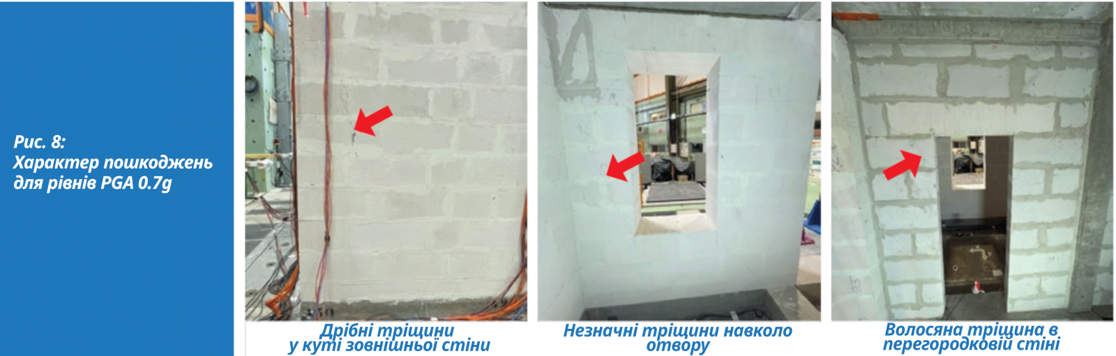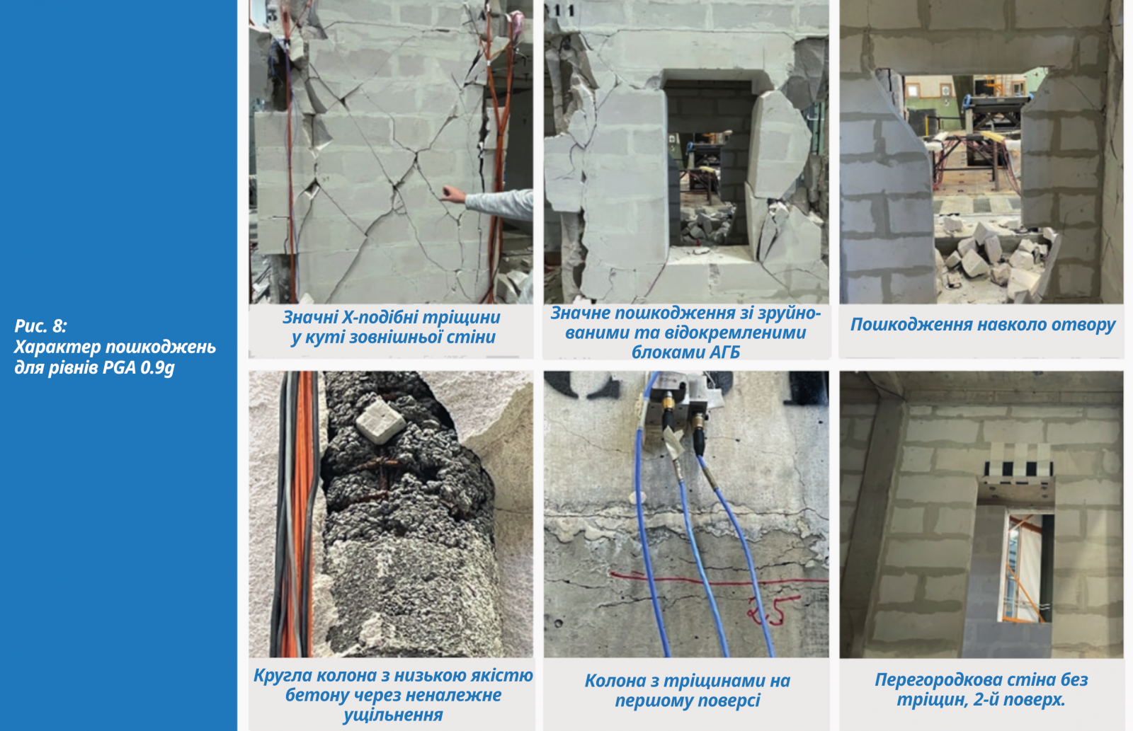Випробування на сейсмічному стенді було проведено для рівнів PGA 0.1g, 0.19g, 0.35g, 0.5g, 0.7g та 0.9g. Після застосування кожного рівня навантаження була виконана візуальна інспекція характеру пошкоджень у ЗБ елементах та стінах з АГБ. Спостерігалося, що конструкція демонструвала лінійно-пружну поведінку аж до рівня навантаження 0.35g. Лише волосяні тріщини з’явилися навколо отворів у зовнішніх та перегородкових стінах з АГБ на першому поверсі, тоді як балки та колони залишалися без тріщин.