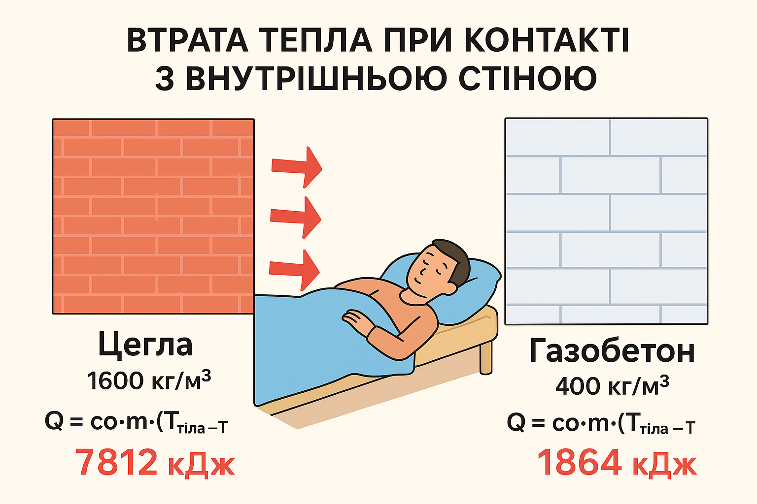 Елементарні розрахунки показують, скільки тепла втратить людина при контакті з цегляною стіною, а скільки при контакті з газобетонною, до тих пір, поки температура тіла не стане рівною температурі стіни.