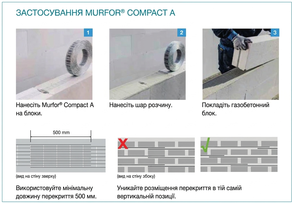 | Зручність будівництва | Murfor Compact легко встановлюється в шви з розчином; не потребує додаткової опалубки чи бетонування. |