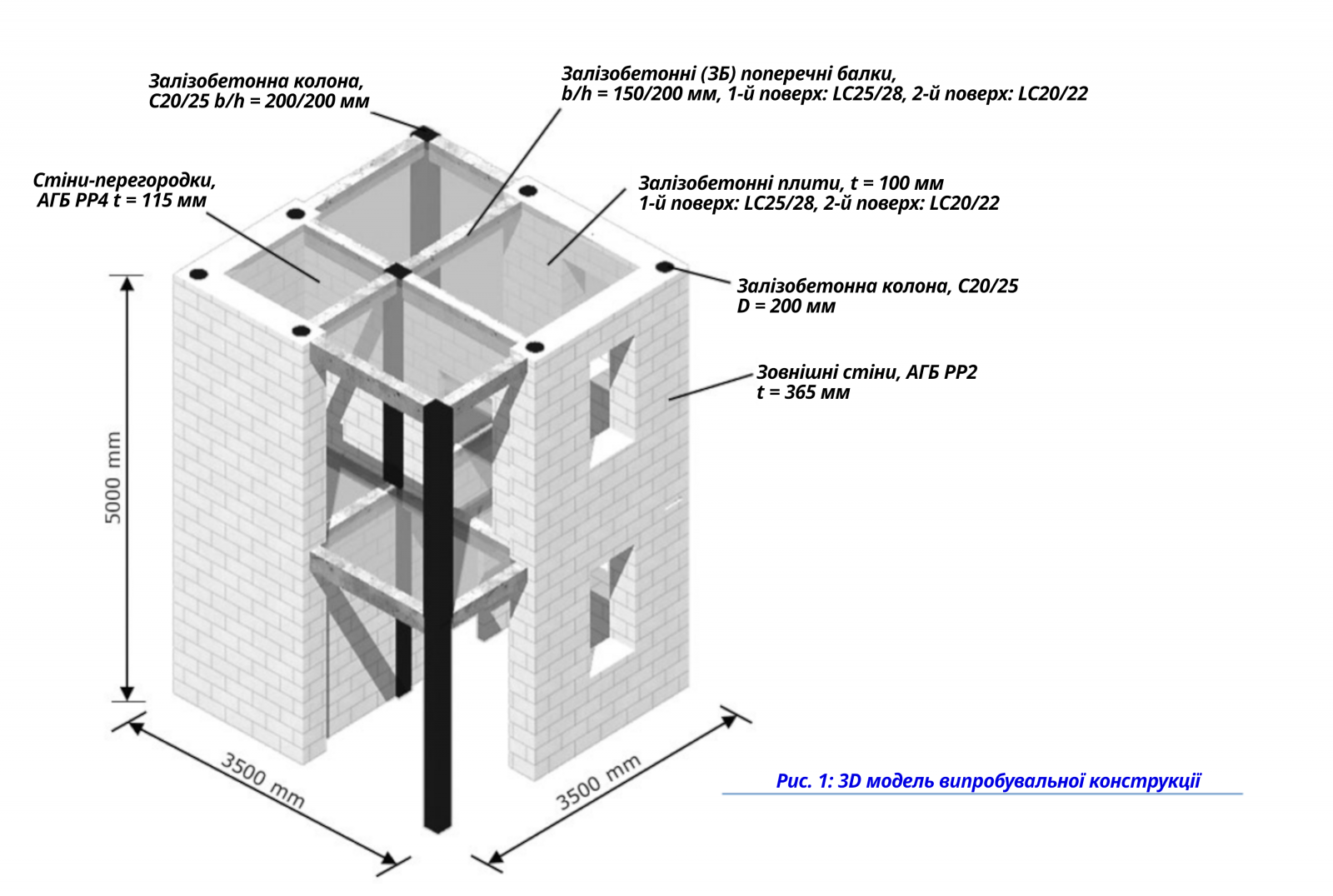 Модель двоповерхової піддослідної конструкції, з матеріалами та розмірами, показаними на Рисунку 1, використовує легку каркасну систему, що складається із залізобетонних колон, балок та плит, доповнену високо теплоізоляційними зовнішніми стінами з АГБ (автоклавний газобетон). Всередині конструкції ненесучі перегородки з АГБ з отворами розташовані перпендикулярно (повернені на 90°) до зовнішніх осей. Будівля має квадратний план розміром близько 3.5 х 3.5 м, з висотою поверху 2.5 м. Вона спирається на сітку із ЗБ балок, що забезпечує як транспортування, так і надійне закріплення до сейсмічного стенда за допомогою анкерних стрижнів. Поперечні балки та плити виготовлені з легкого бетону LC 25/28 на рівні нульового поверху та LC 20/22 на рівні першого поверху. Колони, виготовлені зі звичайно-важкого бетону C20/25, були відлиті у двох конфігураціях: круглі з діаметром 200 мм при інтеграції у блокову опалубку з АГБ на кутах та квадратні при звичайному відливанні. Для кладки АГБ використовується Ytong PP2-0,35 для зовнішніх стін та Ytong ThermCombi PP4-0,55 для внутрішніх перегородок, виконаних у поєднанні з тонкошаровим розчином Ytong FIX N240 [6]. Рис. 2 показує вигляд спереду та ззаду піддослідної конструкції на сейсмічному стенді.