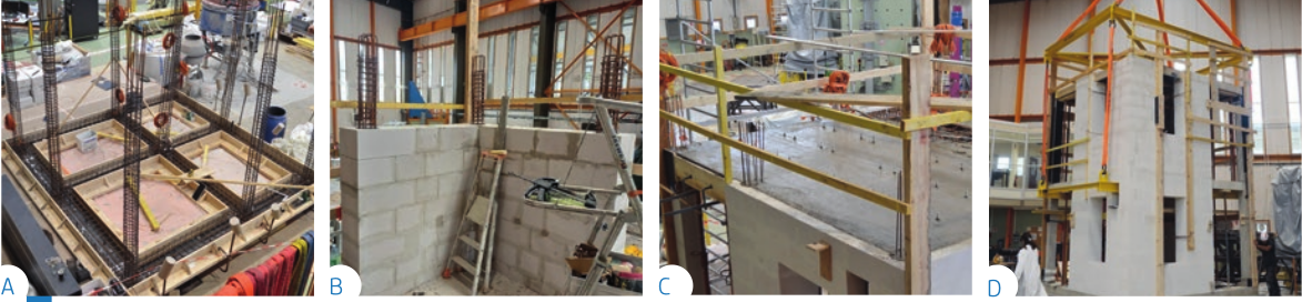 Піддослідну конструкцію було побудовано на сітці із залізобетонних балок, відлитих на сталеві плити товщиною 10 мм з анкерними стрижнями, щоб забезпечити жорстке з’єднання із сейсмічним стендом через анкерування плити. Розміри балок становлять 365/200 мм по периметру та 300/200 мм у внутрішній частині. На Рис. 3а показано опалубку, армування фундаментних балок та продовження армування колон вгору. На наступному етапі зовнішні стіни нульового поверху були зведені з блоків АГБ, використовуючи опалубні блоки з круглими отворами 200 мм на торцях стін, укладені шарами з перев'язкою. Блоки бетонувалися секціями з належним ущільненням під час зведення стін. Кінцеве бетонування вузлів "колона-балка" було виконано разом із плитою перекриття вище, використовуючи легкий бетон на обох поверхах. На нульовому поверсі віконні отвори були обладнані перемичками для підтримки кладки з АГБ вище, тоді як на верхньому поверсі отвори простягаються до рівня залізобетонної балки, тим самим усуваючи необхідність у перемичках. На Рис. 3б проілюстровано розміщення опалубних блоків, а на Рис. 3в — відливання плити на першому поверсі. Після завершення обох поверхів піддослідну конструкцію, збудовану в зоні цеху, було транспортовано на сейсмічний стенд краном. Для цього сталеві профілі були встановлені нижче плити першого поверху через отвори у зовнішніх стінах, до яких була прикріплена вся конструкція. Крім того, стіни були розкріплені дерев'яними брусками. Оскільки максимальна вантажопідйомність крана була обмежена 25 т, переміщення було здійснено до встановлення перегородок. На Рис. 3г показано конструкцію під час процесу підйому.