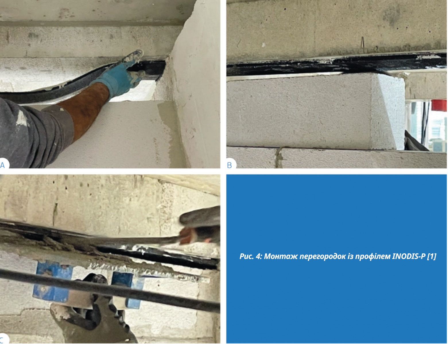 На останньому етапі перегородки були встановлені в перпендикулярному напрямку на нульовому та першому поверхах (Рис. 1). Більший проліт включає дверний отвір, тоді як менший проліт залишається суцільним без будь-яких отворів. Перегородки були встановлені разом із з'єднувальним профілем INODIS-P [1] для забезпечення повного заповнення шва розчином, що є важливим для розвитку аркового ефекту, необхідного для безпечної передачі сил інерції, що діють перпендикулярно до перегородок. Міцне зчеплення між бетоном і профілем досягається шляхом нанесення флісового покриття на плоску сторону профілю, яке використовується в поєднанні з тонкошаровим розчином. Завдяки своїй трикутній формі процес заповнення розчином був легко здійснений. На Рис. 4 показано процес встановлення: (a) прикріплення профілю INODIS-P [1] до плити тонкошаровим розчином, (b) встановлення останнього ряду блоків, та (c) заповнення розчином залишку зазору.