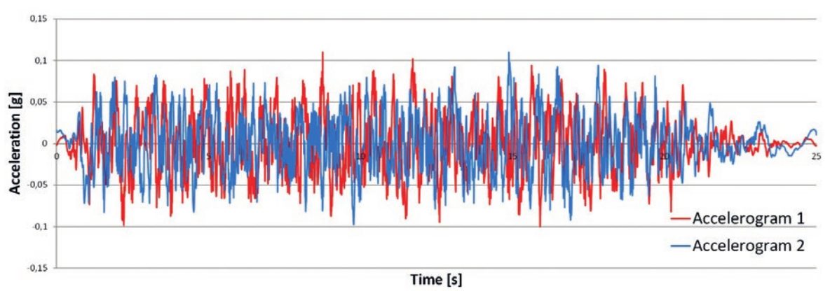 Сейсмічне навантаження визначається лінійним пружним спектром відгуку Типу 1 з ґрунтовими умовами C, відповідно до Єврокоду 8 [4]. Було згенеровано два стохастично незалежні акселерограми, скориговані за базовою лінією та сумісні з цим спектром, із загальною тривалістю 25 с. Піддослідна конструкція піддавалася двоспрямованій сейсмічній дії з використанням двох акселерограм, масштабованих до ідентичних рівнів Пікового Прискорення Ґрунту (PGA). Як приклад, Рис. 3 показує штучні акселерограми, масштабовані до значення PGA 0.1g.