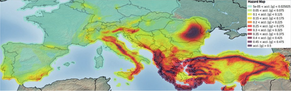 Протягом експериментального дослідження акселерограми були масштабовані до максимуму 0.9g. Щоб помістити це значення в контекст, Рис. 6 показує карту сейсмічної небезпеки для Європи, засновану на значеннях PGA з Європейської моделі сейсмічної небезпеки 2020 року (ESHM20) [3]. Модель надає оновлені, гармонізовані вірогідні карти рівнів коливання ґрунту для періоду повторюваності 475 років. Ці карти також є частиною другого покоління Єврокоду 8 [4] та першої загальноєвропейської моделі ризику землетрусів. Порівняння показує, що значення PGA, досягнуті в прототипній структурі, є дуже високими та значно перевищують ті, що вказані на карті небезпеки.