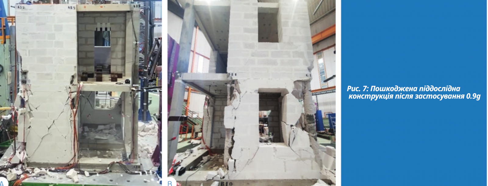 Випробування на сейсмічному стенді було проведено для рівнів PGA 0.1g, 0.19g, 0.35g, 0.5g, 0.7g та 0.9g. Після застосування кожного рівня навантаження була виконана візуальна інспекція характеру пошкоджень у ЗБ елементах та стінах з АГБ. Спостерігалося, що конструкція демонструвала лінійно-пружну поведінку аж до рівня навантаження 0.35g. Лише волосяні тріщини з’явилися навколо отворів у зовнішніх та перегородкових стінах з АГБ на нульовому поверсі, тоді як балки та колони залишалися без тріщин.